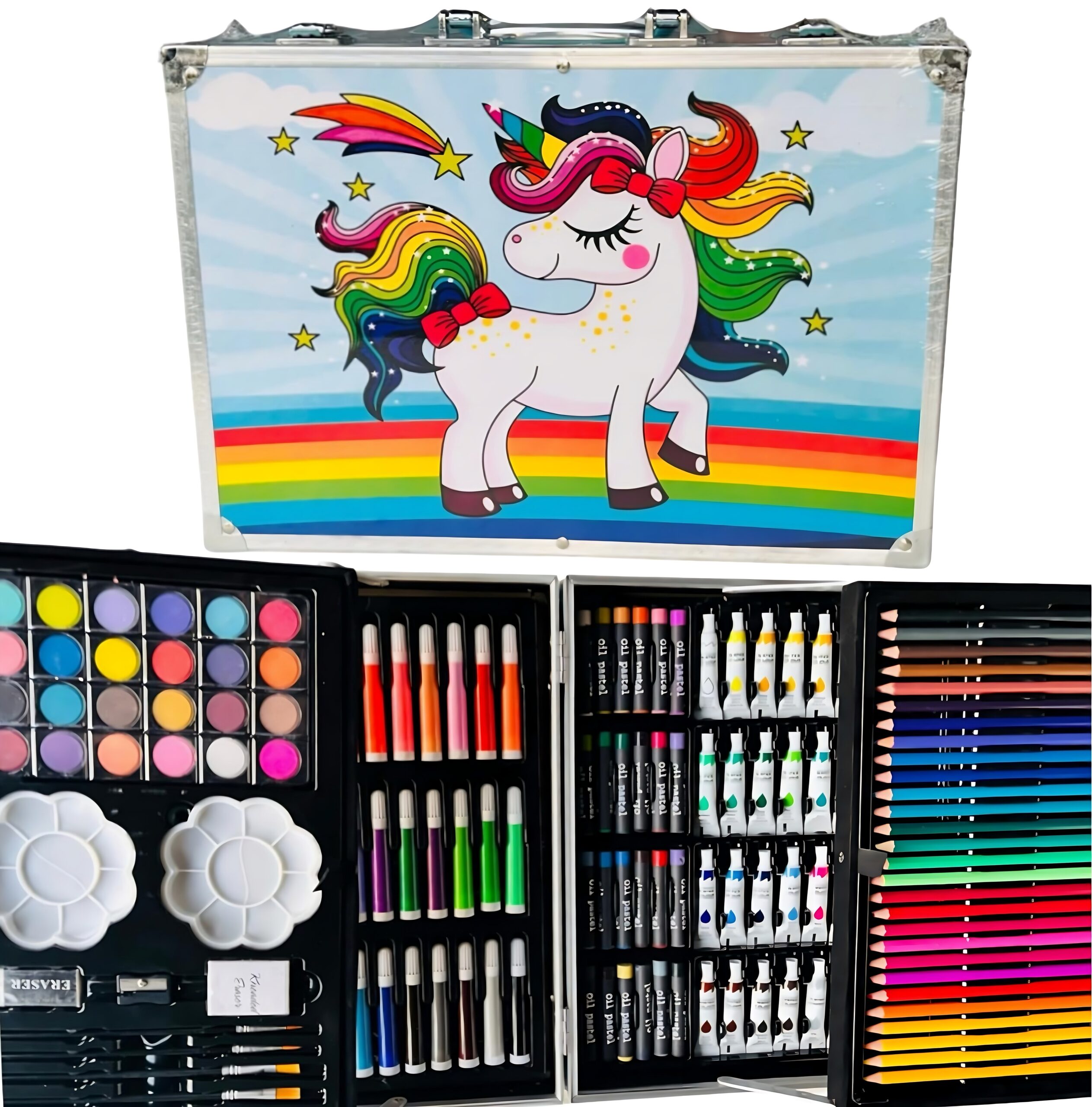 Versatile Art Set Include: 28 Colour pencils , 24 Watercolour, 33 Markers, 24 Oil pastel, 24 Watercolour cakes, 3 plastic palettes, 4 bristle brushes: round and flat , 2 Pencils, 2 eraser, 1 pencil sharpener.